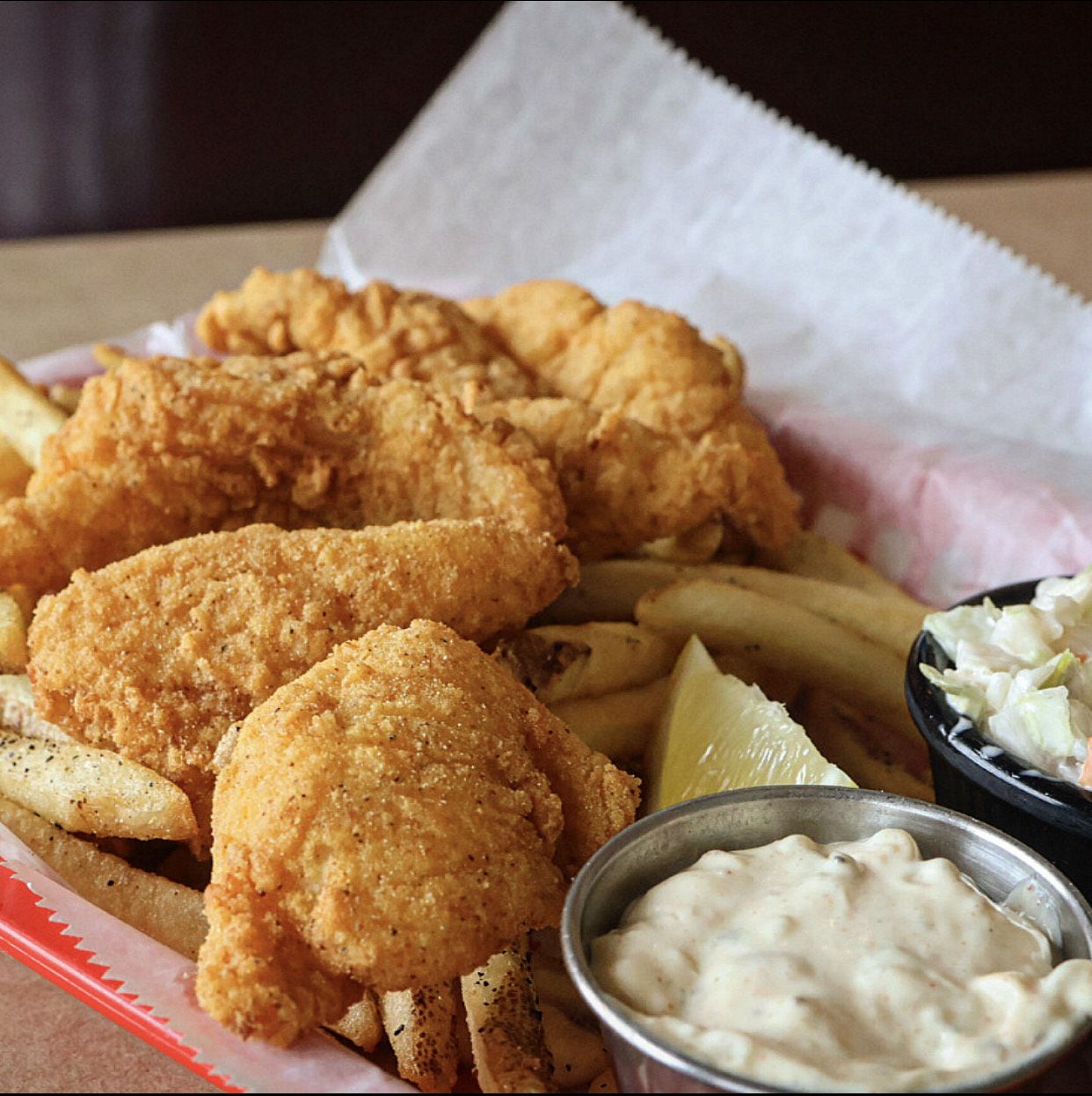 Served golden crispy with baby cakes & coleslaw.